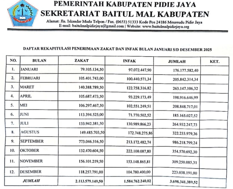 Ketua BMK Pidie Jaya, Tgk. Zulkifli Harun melalui Kepala Sekretariat Teuku Yulius, menyebutkan penyaluran zakat dan infak ini merupakan hasil pengumpulan dana selama tahun 2025. Total dana yang berhasil dihimpun mencapai Rp3,69 miliar lebih, yang bersumber dari zakat sebesar Rp2,11 miliar lebih dan infak Rp1,58 miliar lebih.
