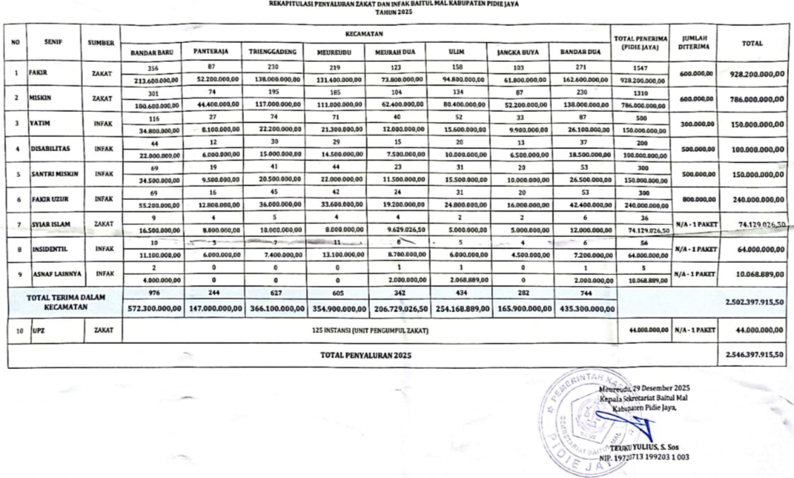 Baitul Mal Pidie Jaya Salurkan Rp2,5 Miliar Dana Zakat dan Infak Akhir 2025