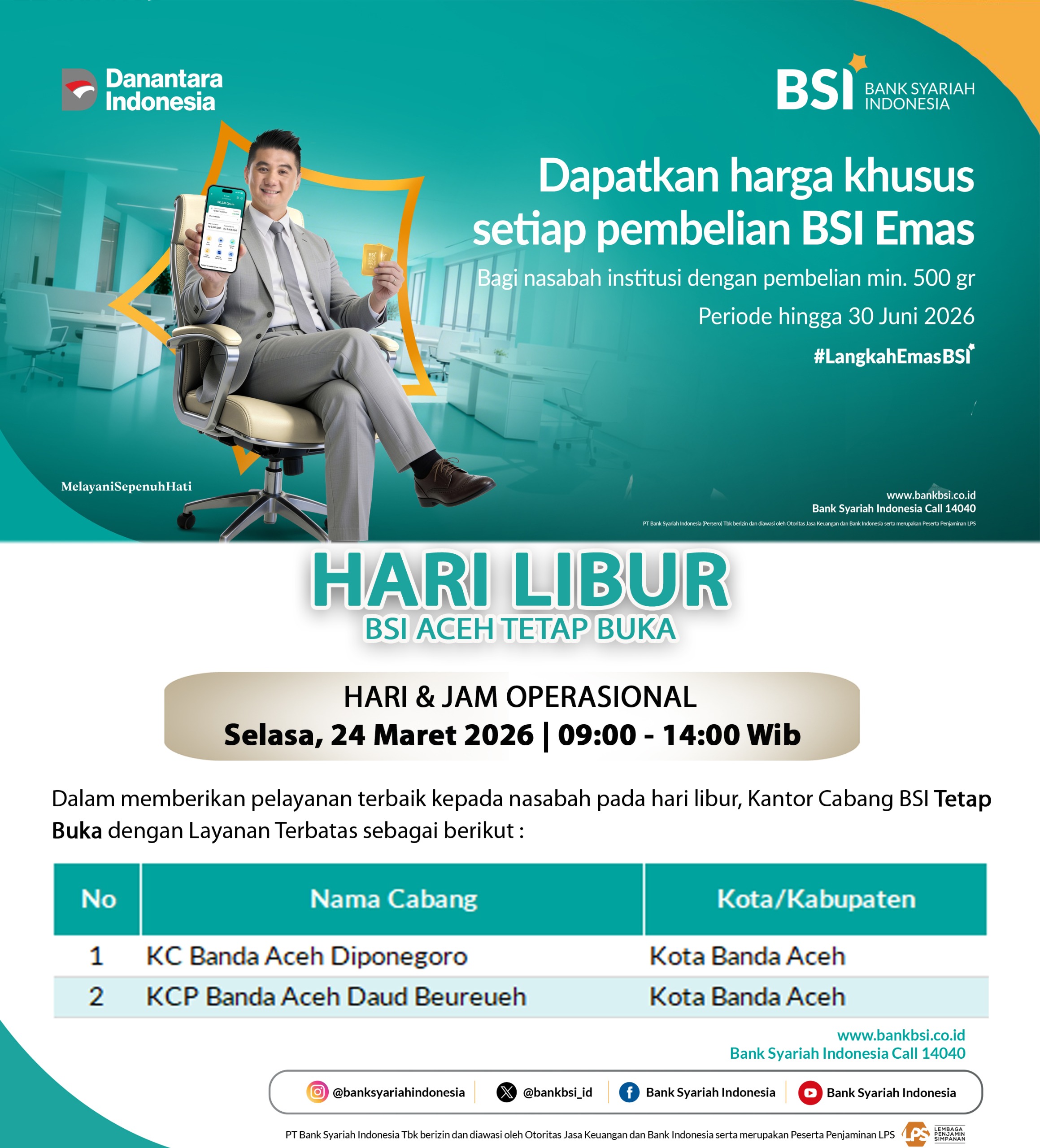 LIPUTANGAMPONGNEWS.ID - Dalam rangka memberikan pelayanan optimal kepada masyarakat pada momen libur panjang Idul Fitri 1447 H, Bank Syariah Indonesia (BSI) Regional Aceh memastikan tetap membuka layanan operasional terbatas di sejumlah outlet.