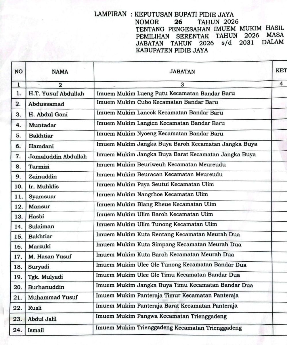 Prosesi pelantikan yang berlangsung di Aula Cot Trieng Lantai III Kantor Bupati Pidie Jaya itu tampak khidmat dan meriah. Para Imum Mukim yang dilantik untuk periode 2026-2031 mengenakan pakaian adat Aceh, menambah nuansa sakral dalam kegiatan tersebut.