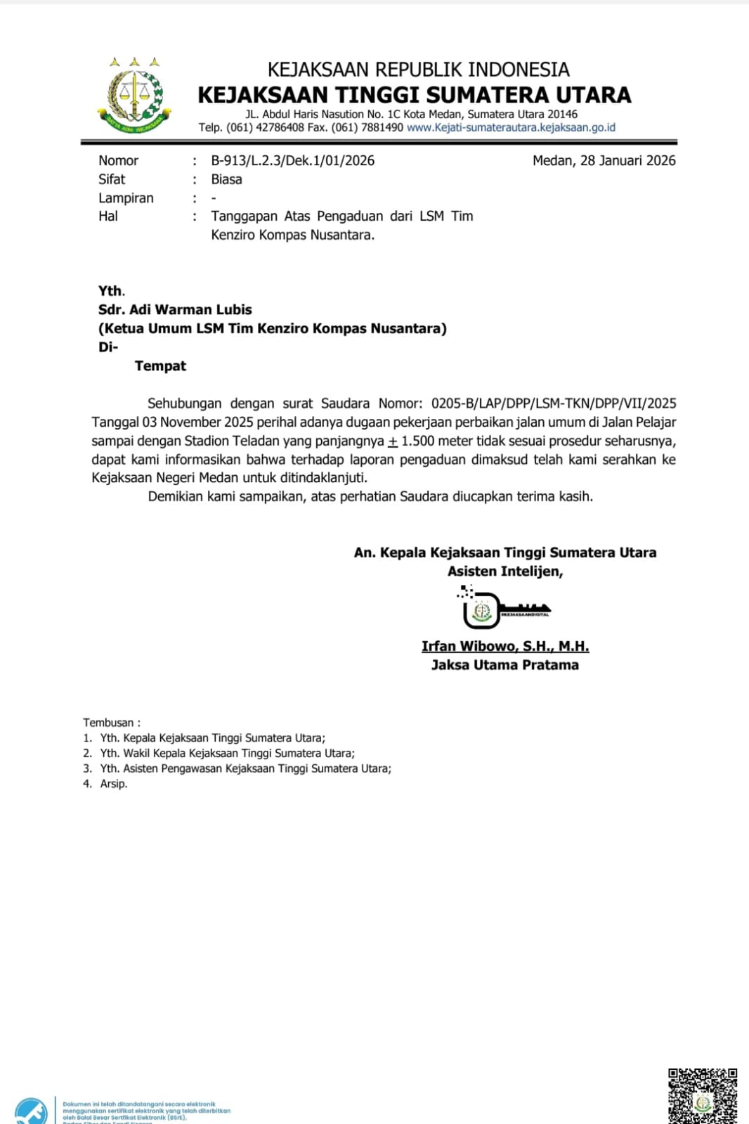 “Kami sudah memasukkan pengaduan masyarakat (dumas) dan menyurati sejumlah pihak, mulai dari kepolisian, Kejaksaan Tinggi Sumatera Utara, hingga instansi terkait lainnya. Bahkan, surat konfirmasi kepada Dinas PU Kota Medan sudah dua kali kami layangkan, namun tidak pernah mendapat jawaban,” tegas Adi Lubis, Jumat, 13 Februari 2026 di Kantor Sekretariat DPP TKN Kompas Nusantara Jalan Prof. H.M. Yamin, S.H Medan.