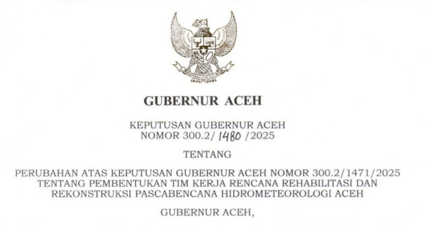 Penetapan tim tersebut tertuang dalam Surat Keputusan Gubernur Aceh Nomor 300.2/1471/2025 tentang Pembentukan Tim Kerja R3P Hidrometeorologi Aceh, yang selanjutnya mengalami perubahan melalui SK Gubernur Aceh Nomor 300.2/1480/2025 tentang Perubahan atas SK Tim Kerja R3P Hidrometeorologi Aceh.