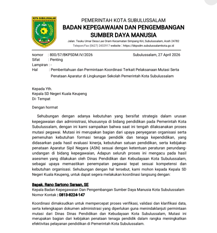 LIPUTANGAMPONGNEWS.ID - Dugaan penipuan berkedok mutasi Aparatur Sipil Negara (ASN) di lingkungan sekolah dasar (SD) dan sekolah menengah pertama (SMP) Kota Subulussalam mencuat ke publik. Surat yang mengatasnamakan Badan Kepegawaian dan Pengembangan Sumber Daya Manusia (BKPSDM) tersebut beredar luas pada Senin, 27 April 2026.