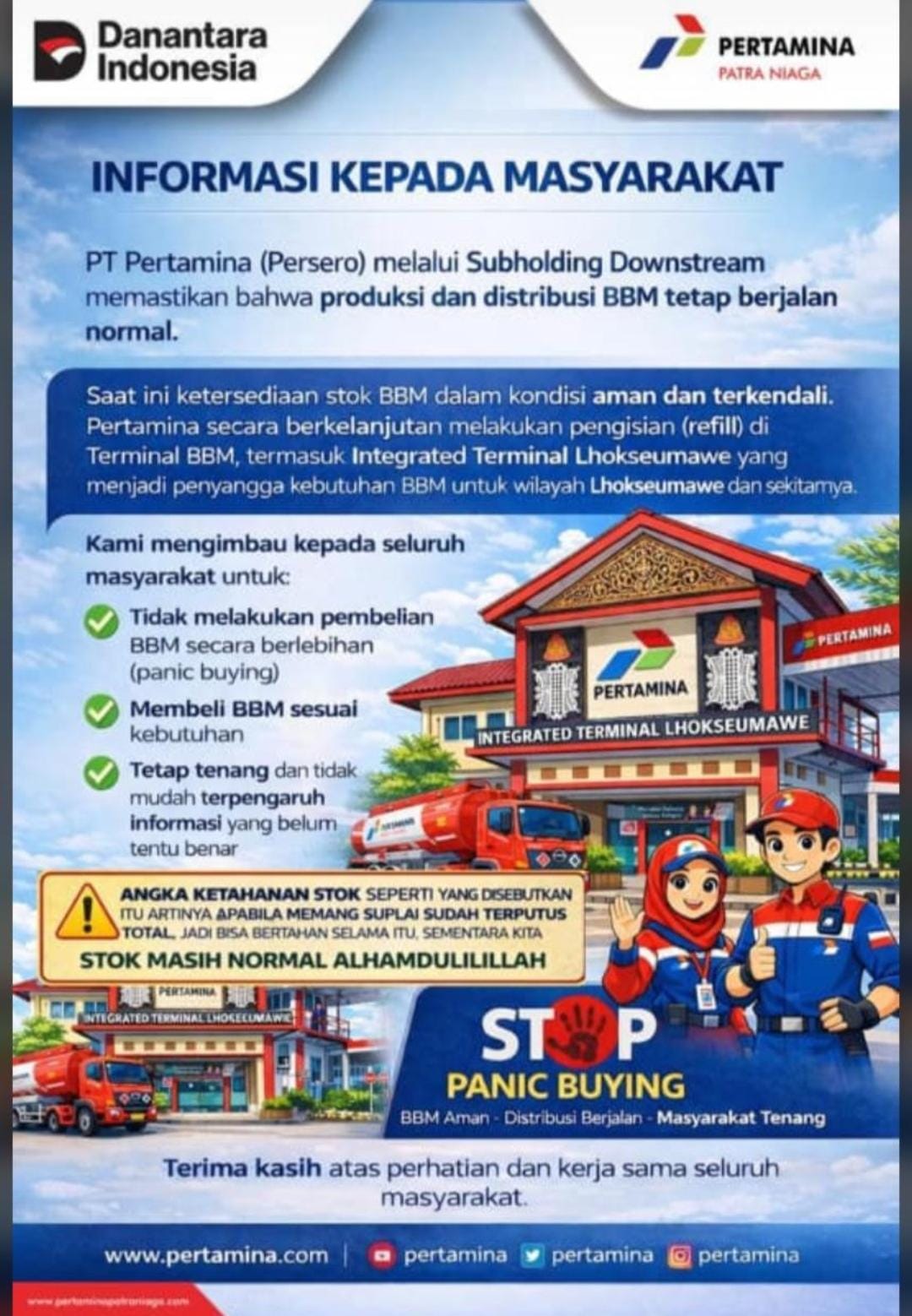 Selain itu, Dahlan mengajak masyarakat untuk membeli BBM sesuai kebutuhan dan tidak melakukan pembelian secara berlebihan. Ia menilai kepanikan yang berlebihan justru dapat memicu antrean panjang dan menimbulkan kesan seolah-olah terjadi kelangkaan, padahal stok BBM masih tersedia.
