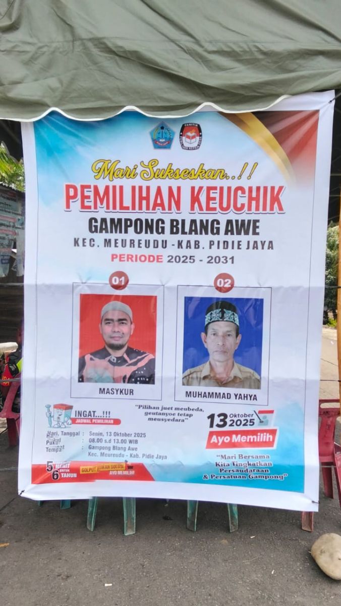 LIPUTANGAMPONGNEWS.ID - Pemilihan Keuchik Gampong Blang Awe, Kecamatan Meureudu, Kabupaten Pidie Jaya, Senin (13/10), berlangsung tertib dan demokratis. Ratusan warga datang ke tempat pemungutan suara sejak pagi untuk menyalurkan hak pilih mereka dalam Pilchiksung serentak tahun 2025. Dari hasil penghitungan suara yang dilakukan di TPS 1, calon nomor urut 1 Masykur unggul telak atas lawannya Muhammad Yahya.