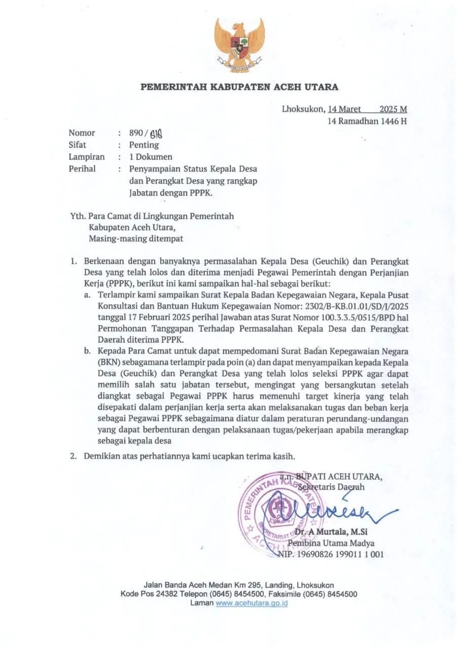 LIPUTANGAMPONGNEWS.ID - Pemerintah Kabupaten Aceh Utara mengeluarkan surat resmi terkait penyampaian status kepala desa (Keuchik) dan perangkat desa yang lulus sebagai Pegawai Pemerintah dengan Perjanjian Kerja (PPPK). Surat bernomor 890/818 tersebut ditandatangani di Lhoksukon pada 14 Maret 2025 M, ditujukan kepada seluruh camat di lingkungan Pemkab Aceh Utara.