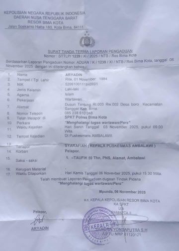 Dalam laporannya, Aryadin menjelaskan bahwa peristiwa penghalangan tersebut terjadi pada hari Senin, 3 November 2025, sekitar pukul 09.00 Wita di Puskesmas Ambalawi.