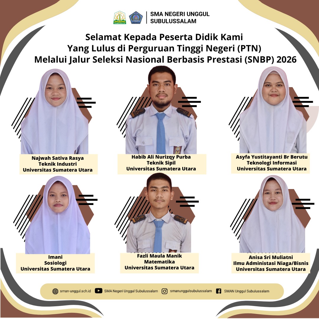 LIPUTANGAMPONGNEWS.ID - SMAN Unggul Subulussalam kembali menunjukkan performa impresif dalam Seleksi Nasional Berdasarkan Prestasi (SNBP) 2026. Sebanyak 36 siswa berhasil menembus berbagai perguruan tinggi negeri (PTN) ternama di Indonesia. Dari jumlah tersebut, capaian di bidang Kedokteran menjadi sorotan utama.