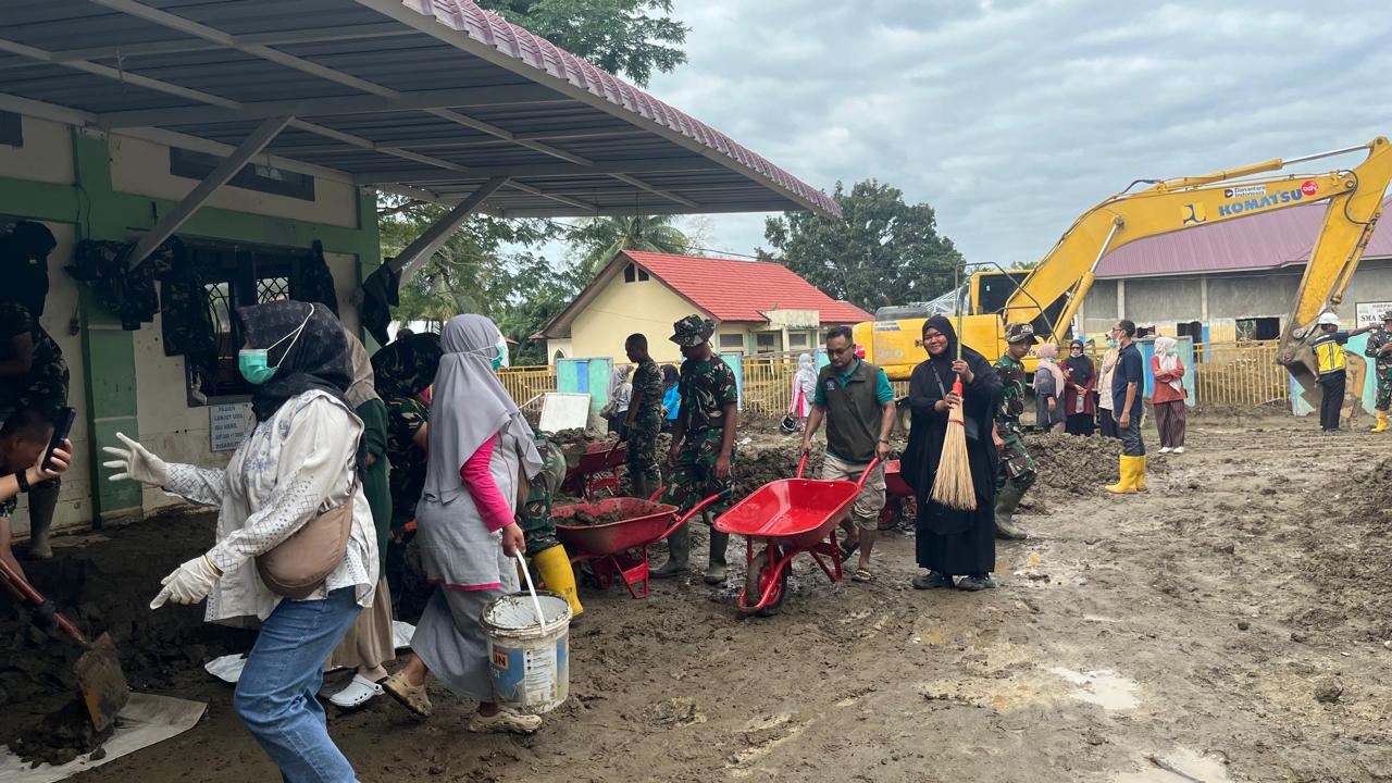 Dengan semangat kebersamaan, puluhan tenaga medis dan personel TNI bahu-membahu membersihkan lumpur, mengevakuasi material yang rusak, serta menata kembali lingkungan puskesmas agar dapat segera difungsikan kembali untuk pelayanan kesehatan masyarakat.