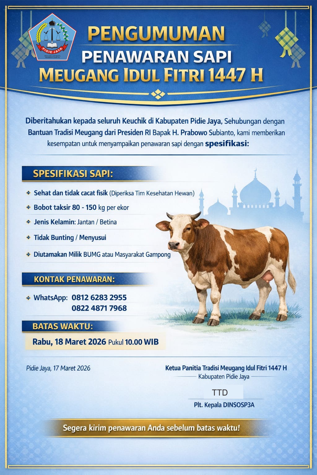 LIPUTANGAMPONGNEWS.ID - Kabar baik datang bagi masyarakat Kabupaten Pidie Jaya. Pemerintah daerah setempat membuka kesempatan luas bagi warga untuk berpartisipasi dalam penyediaan sapi dalam tradisi Meugang Idul Fitri 1447 Hijriah, menyusul bantuan langsung dari Presiden RI Prabowo Subianto..