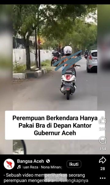 LIPUTANGAMPONGNEWS.ID - Media sosial digegerkan dengan beredarnya sebuah video yang memperlihatkan seorang perempuan mengendarai sepeda motor hanya mengenakan bra di kawasan depan Kantor Gubernur Aceh. Unggahan video tersebut pertama kali dibagikan oleh akun Facebook Bangsa Aceh dan langsung menuai ratusan komentar warganet.