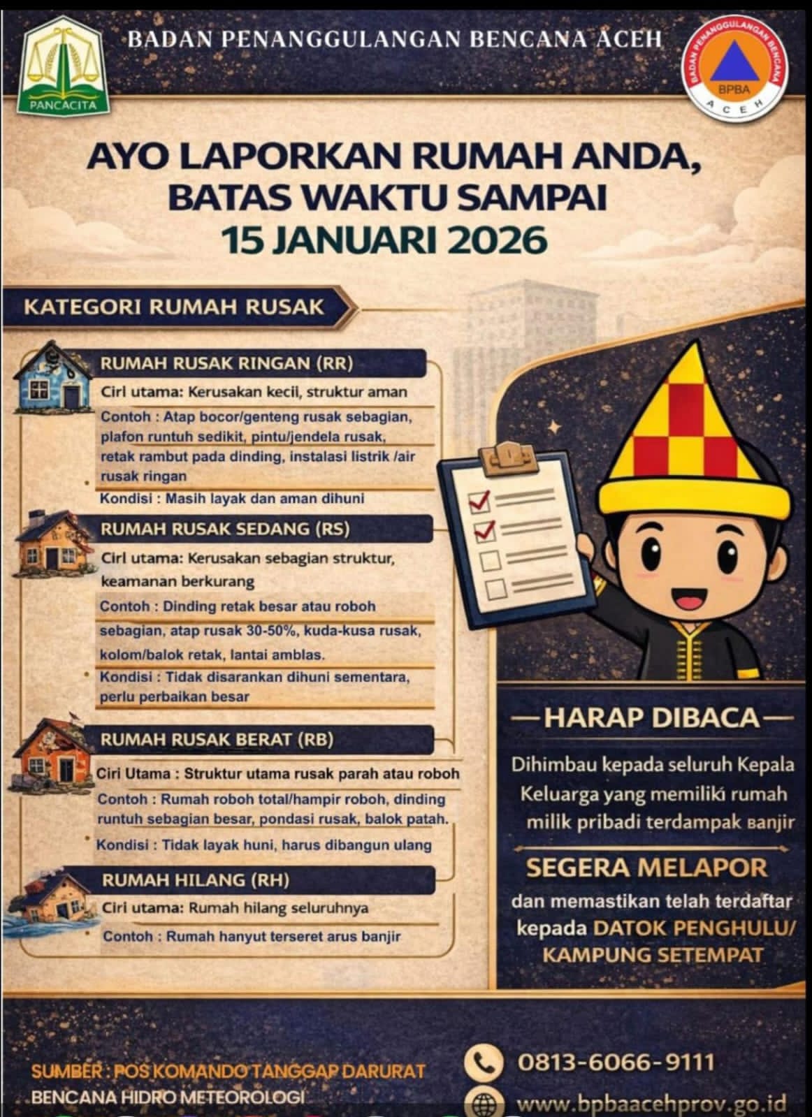 LIPUTANGAMPONGNEWS.ID -Badan Penanggulangan Bencana Aceh (BPBA) mengimbau seluruh masyarakat yang rumahnya terdampak bencana hidrometeorologi untuk segera melaporkan kondisi hunian mereka. Imbauan