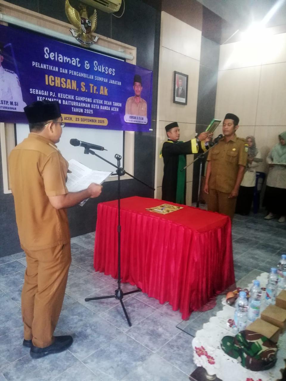 LIPUTANGAMPONGNEWS.ID - Suasana khidmat menyelimuti Aula Kantor Camat Baiturrahman, Selasa (23/9/2025), saat Ichsan, S.Tr.Ak, resmi dilantik sebagai Penjabat (Pj) Keuchik Gampong Ateuk Deah
