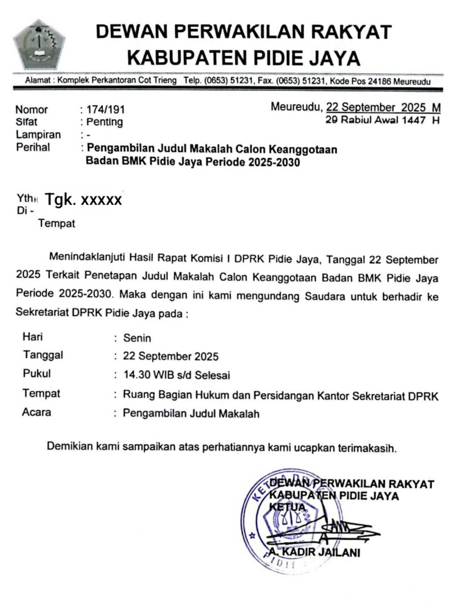 LIPUTANGAMPONGNEWS.ID - Proses seleksi calon anggota Komisioner Baitul Mal Kabupaten (BMK) Pidie Jaya, akhirnya berlanjut ke tahap uji kelayakan dan kepatutan yang akan digelar oleh Komisi I