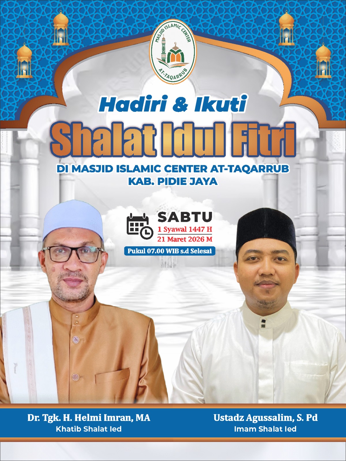Sementara itu, pelaksanaan Shalat Idulfitri akan dipimpin oleh Alhafidz Ustadz Agussalim, S.Pd, yang merupakan guru di MUQ Pidie Jaya. Pengurus masjid secara konsisten menghadirkan imam dari kalangan qari dan hafidz yang memiliki kualitas bacaan Al-Qur’an yang baik dan sesuai dengan kaidah ilmu tajwid. Hal ini dilakukan untuk menjaga kekhusyukan dan kesempurnaan ibadah jamaah yang hadir setiap Hari Raya.