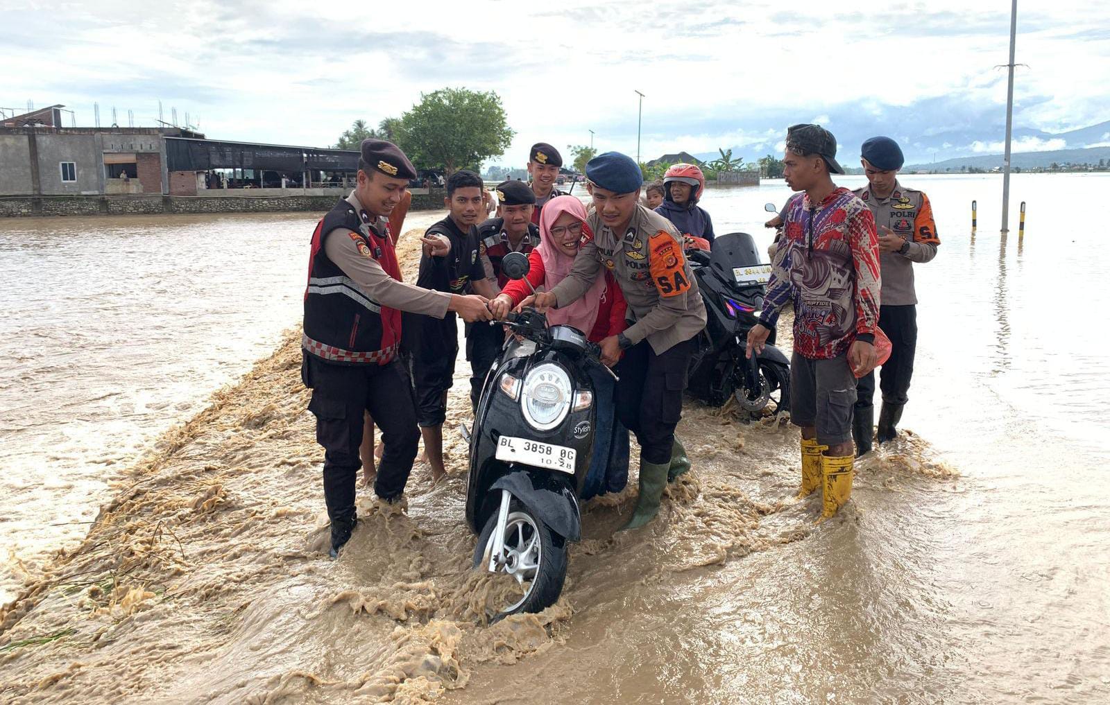 Foto : Personil Polres Pidie Jaya membantu warga yang melintas jalan yang tergenang air berarus deras. | LIPUTAN GAMPONG NEWS