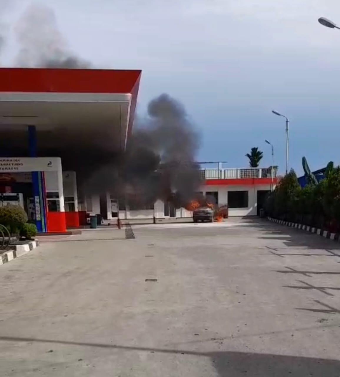 LIPUTANGAMPONGNEWS.ID - Satu unit mobil sedan Toyota Vios berwarna hitam mendadak terbakar saat sedang melakukan pengisian bahan bakar minyak (BBM) di SPBU Gampong Meunasah Jurong, Kecamatan