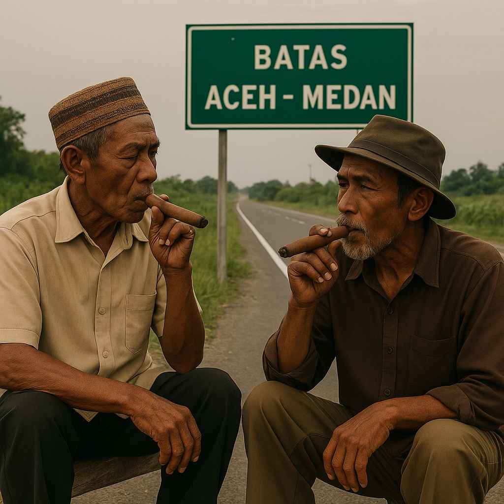LIPUTANGAMPONGNEWS.ID PROHCAKRA - Di pos perbatasan Aceh–Sumut, Pawang Beurandeh dan Polem Beuransah duduk prohcakra sambil menghisap cerutu bakong Aceh. Dari kejauhan, truk BK lewat